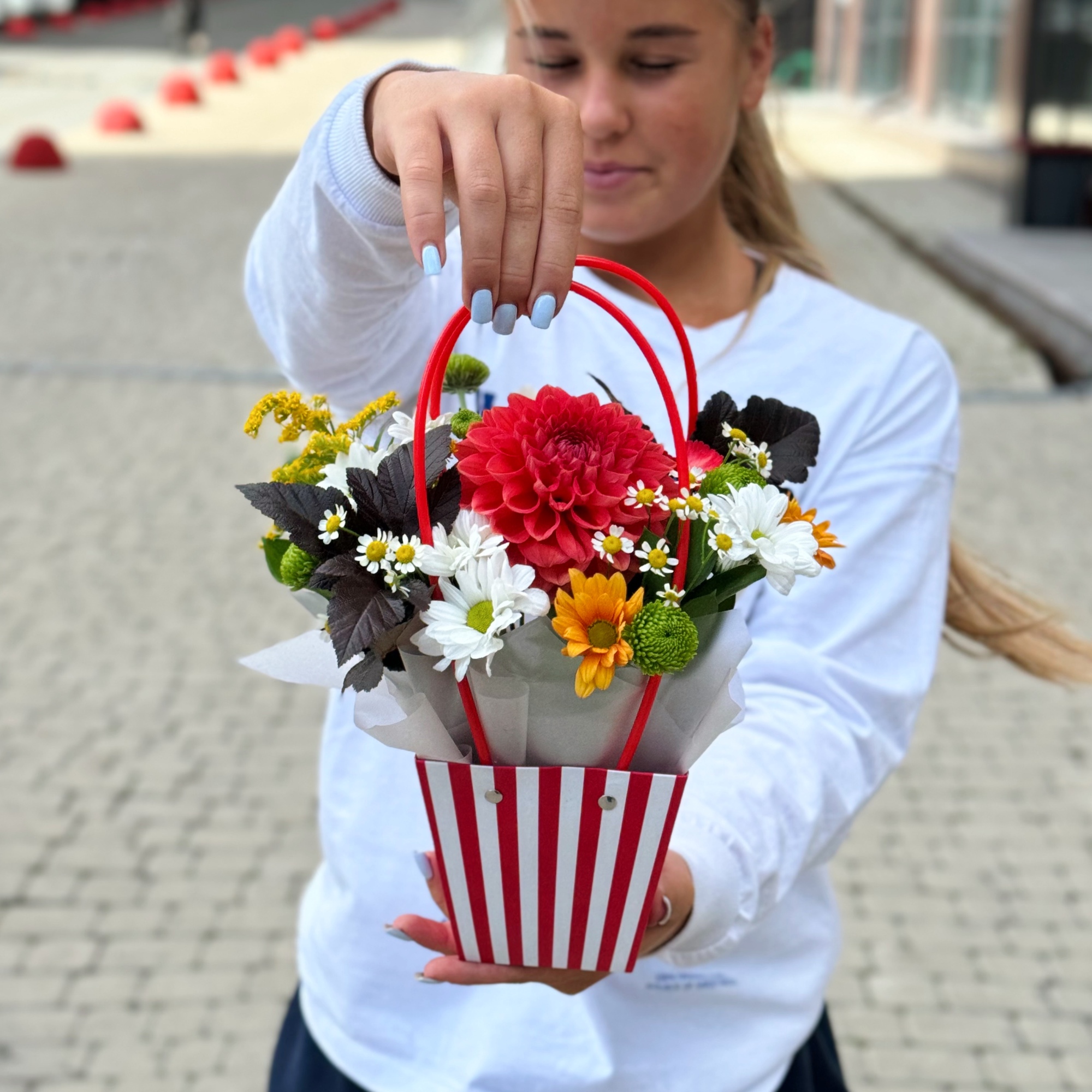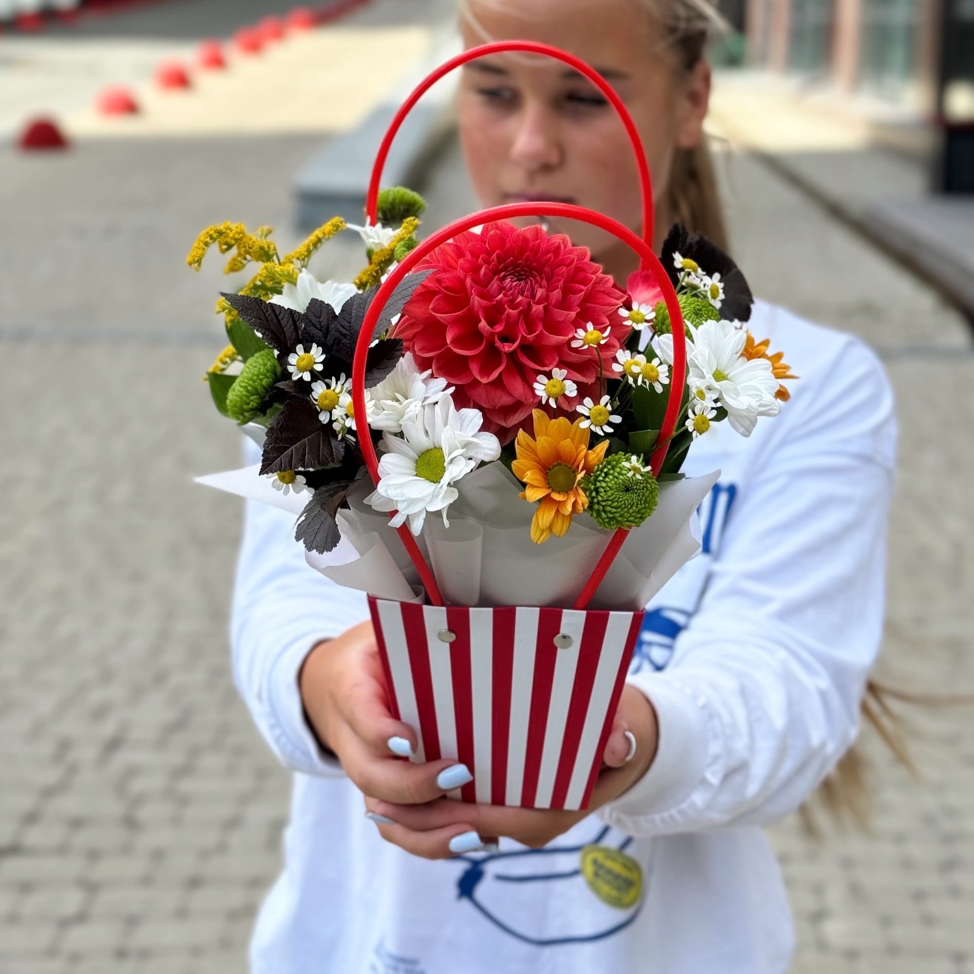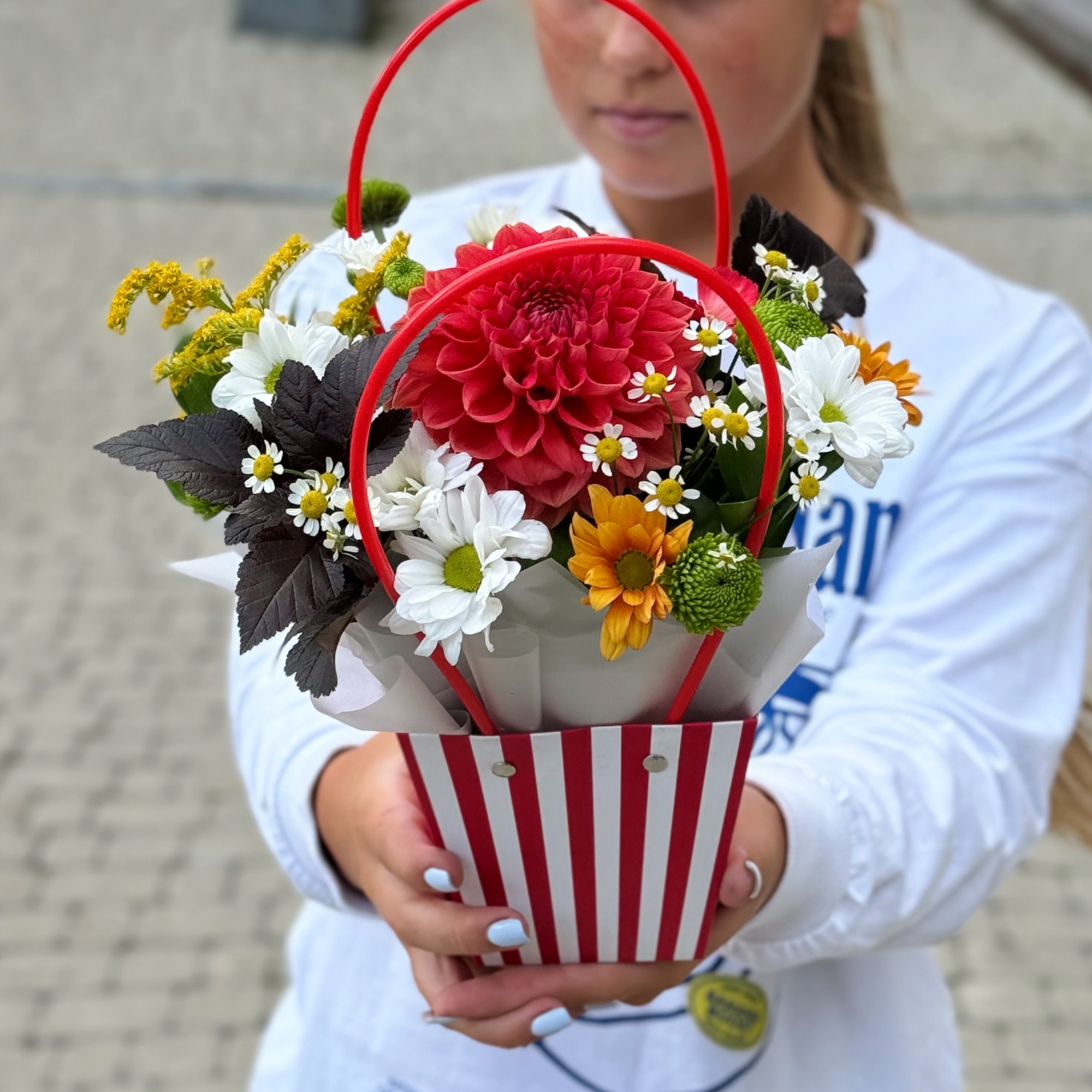 Состав: сумочка 1 шт., георгин 1 шт., танацетум 1 шт., хризантема кустовая 2 шт., солидага 1 шт., зелень.