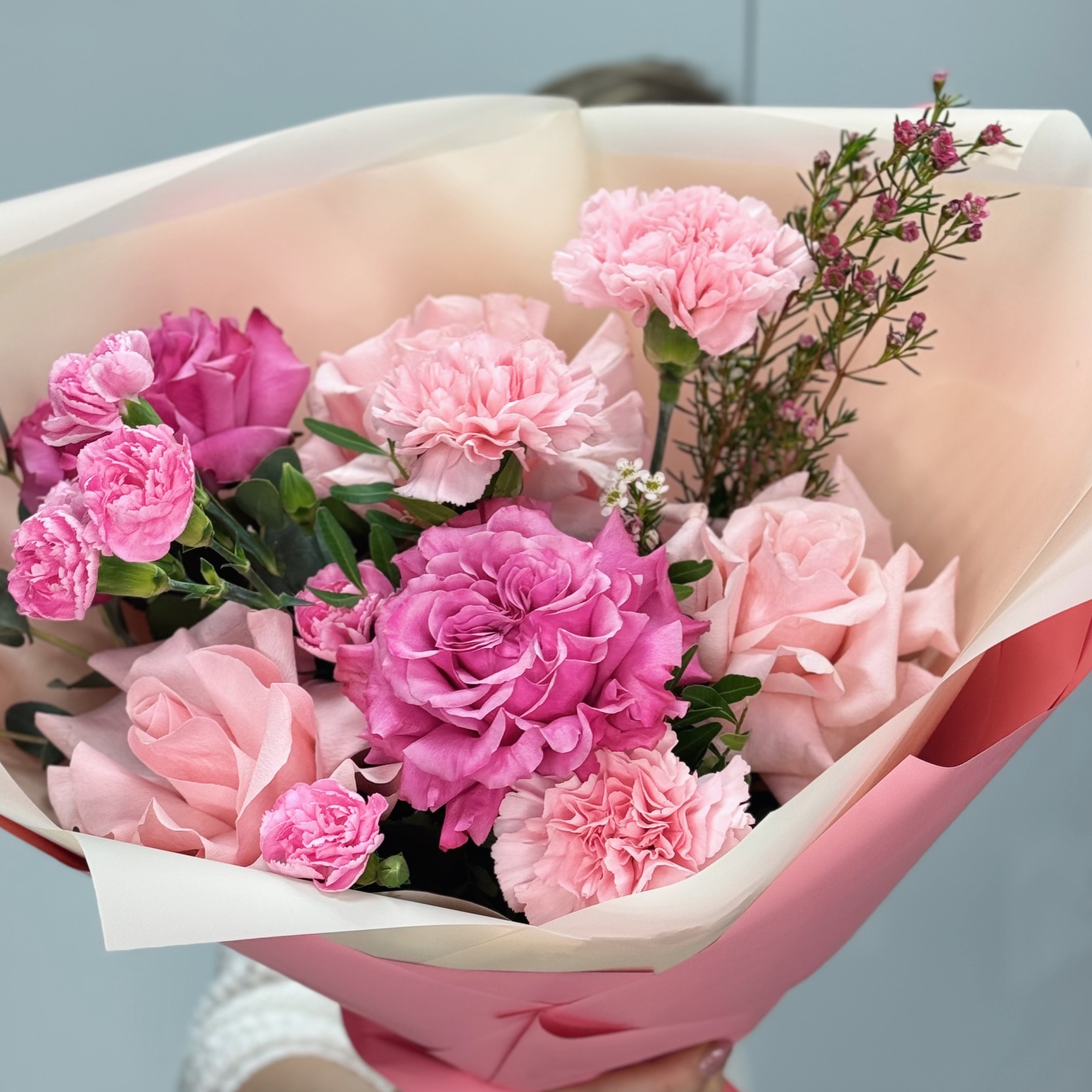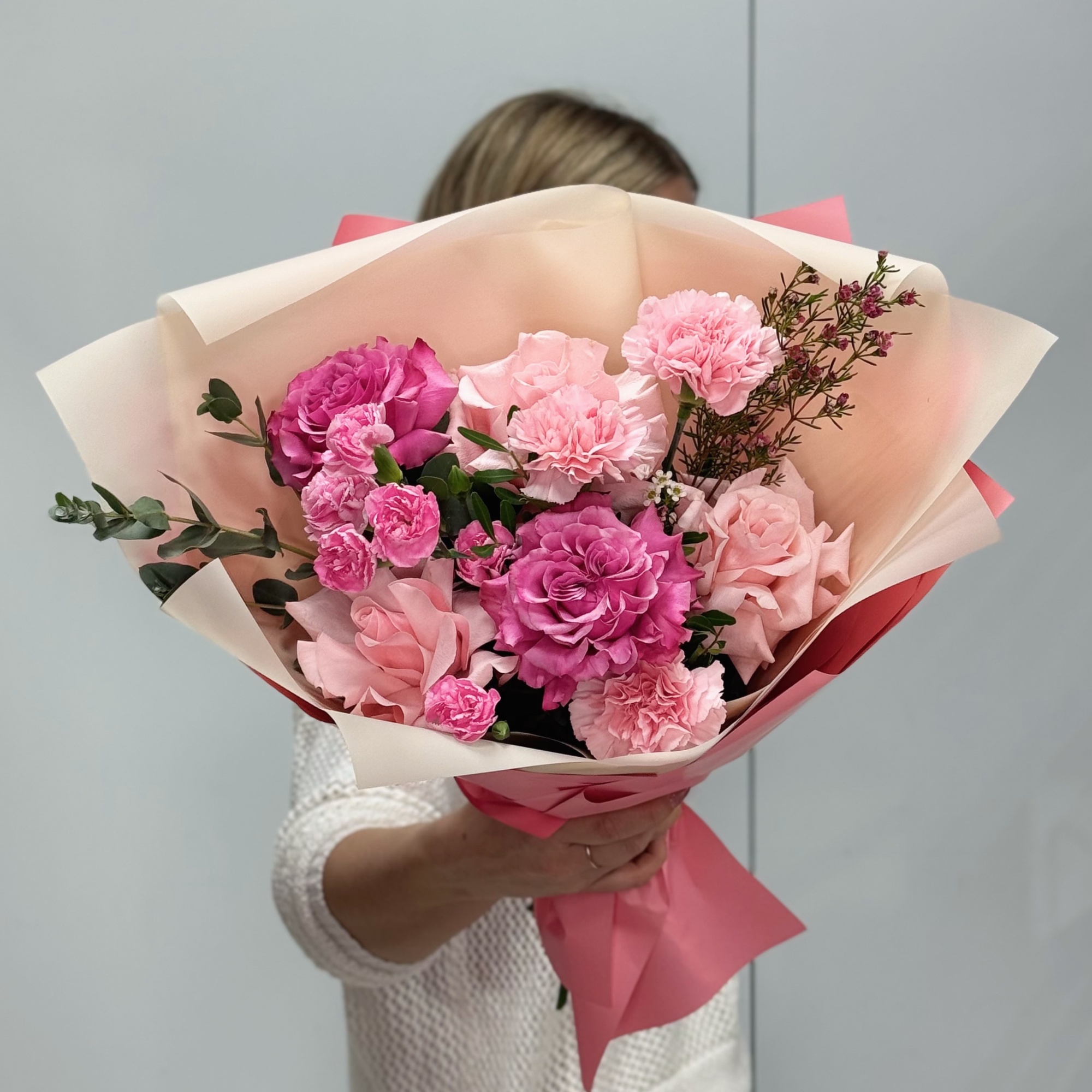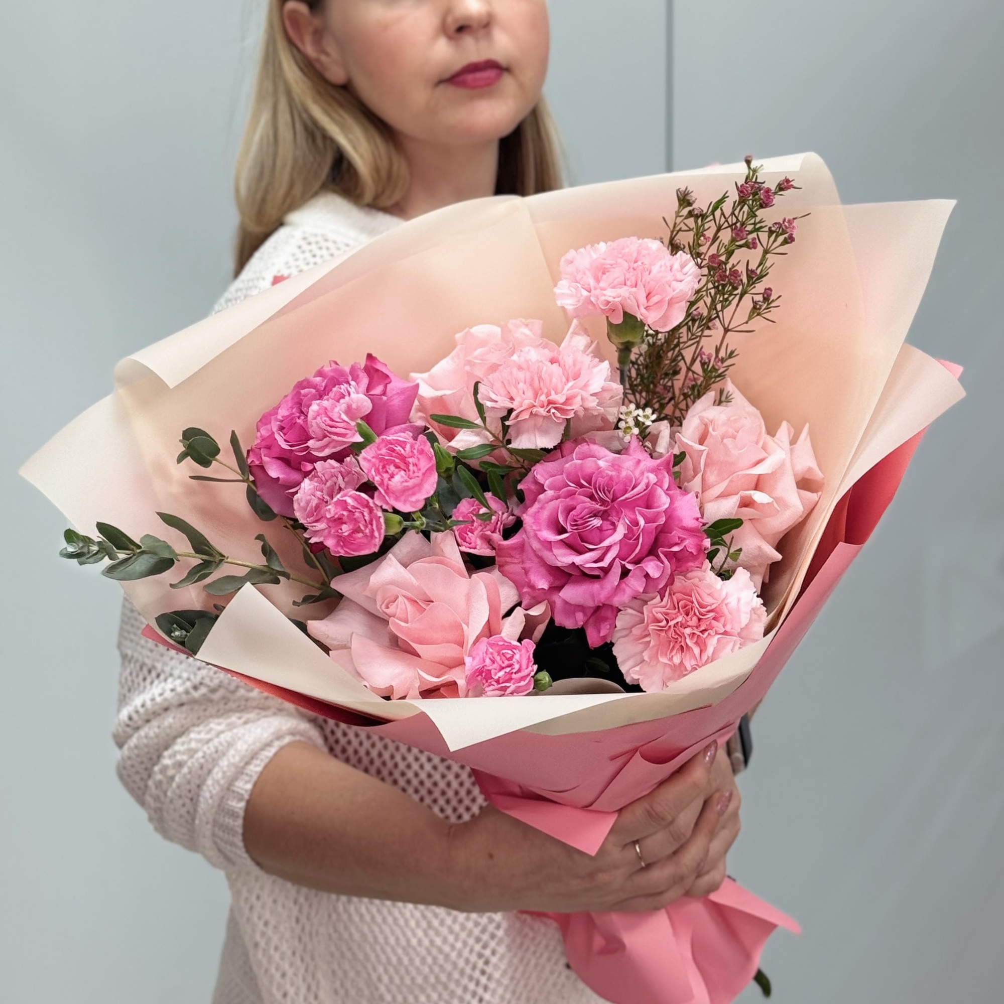 СОСТАВ БУКЕТА: роза "французская" 5 шт., роза пионовидная 2 шт., ваксфлауэр 1 шт., диантус 3 шт., диантус кустовой 1 шт., эвкалипт, зелень (пистация), упаковка