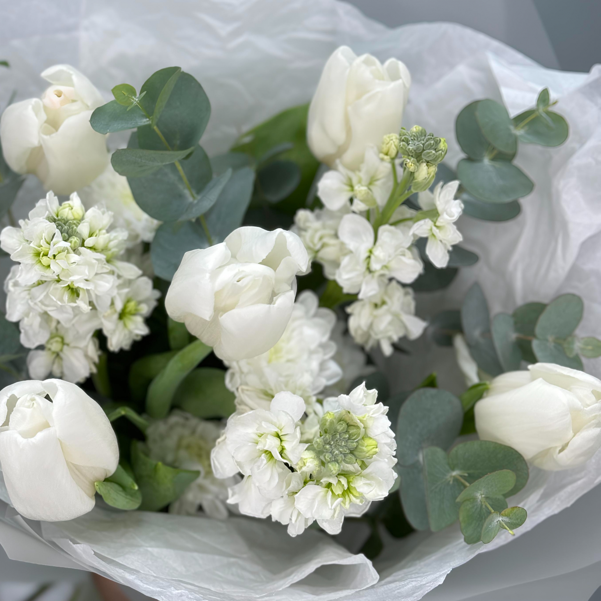 Состав: тюльпаны 5 шт., маттиола 3 шт., хризантема кустовая 2 шт., эвкалипт, дизайнерская упаковка.